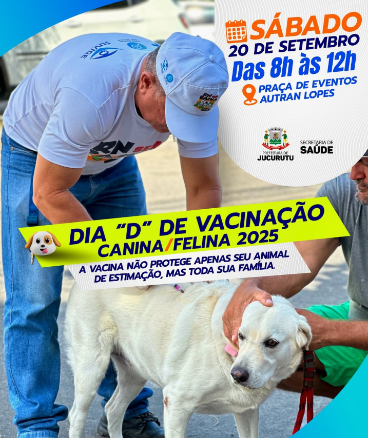 Neste sábado, 20 de setembro, das 8h às 12h, leve seu pet até a Praça de Eventos Autran Lopes para garantir a vacinação antirrábica. A iniciativa, organizada pela Prefeitura e pela equipe de saúde animal, busca proteger não apenas os animais, mas toda a família.